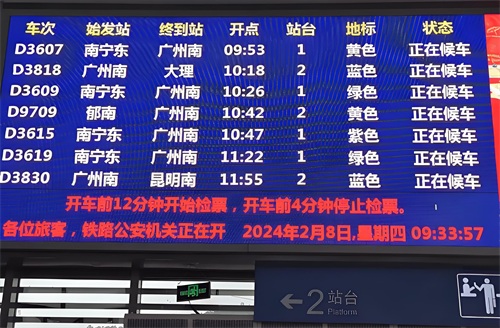 查看候车室屏幕信息:检票前,请务必留意候车室内显示各车次相关信息的大屏幕上标注的地标颜色。