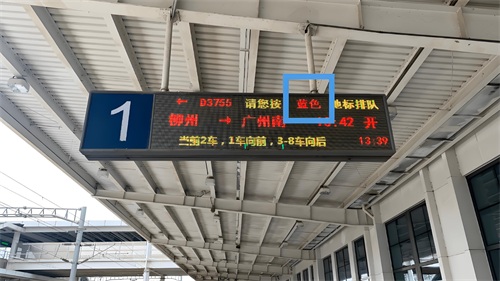 关注站台显示屏提示:进入站台后,再次确认位于上方悬挂的电子显示屏中有关当前车次的具体地标颜色及其对应车厢号。