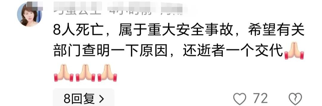 “8人死亡,属于重大安全事故,希望有关部门查明原因,还逝者一个交代!”有网友觉得必须查明白,也给网友们提个醒,避免发生类似事故。