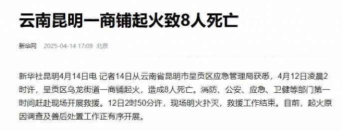 4月14日据媒体报道,4月12日凌晨2点左右,昆明市呈贡区乌龙街道一家商铺突然起火,大火燃烧了50分钟被扑灭,但是官方报道有8人不幸遇难了。什么原因导致商铺起火呢?为什么会有8人被困在火中遇难呢?网友们有很多的疑问。