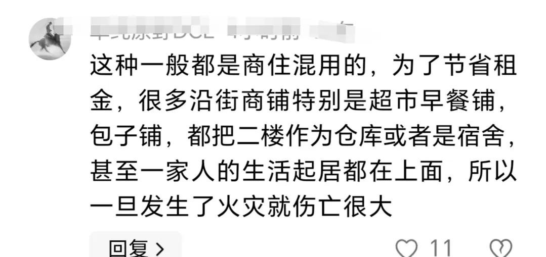 为什么一家商铺晚上起火,会有8人不幸遇难呢?有网友就说了,“这种都是商住混用的,为了节省租金,沿街商铺做生意,二楼当成仓库或者宿舍,甚至一家人的生活起居都在二楼,所以一旦发生火灾伤亡很大。”
