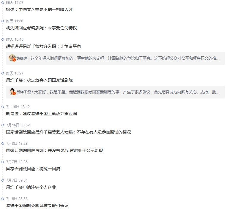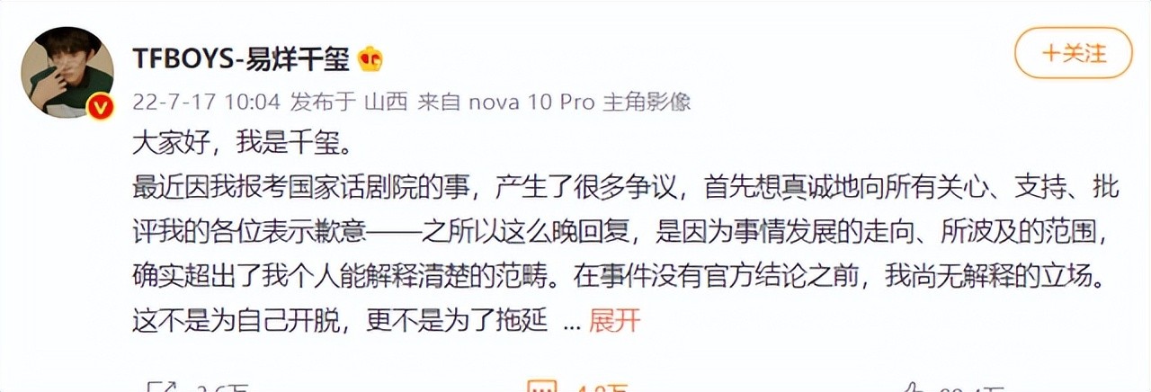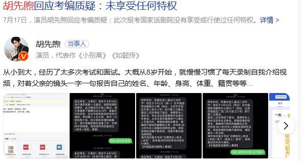 7月17日,易烊千玺沉寂多日后终于发声回应,称已放弃入职国话,没有走捷径,同日,胡先煦发文晒行程报名证明等图片证据,并表示不放弃编制