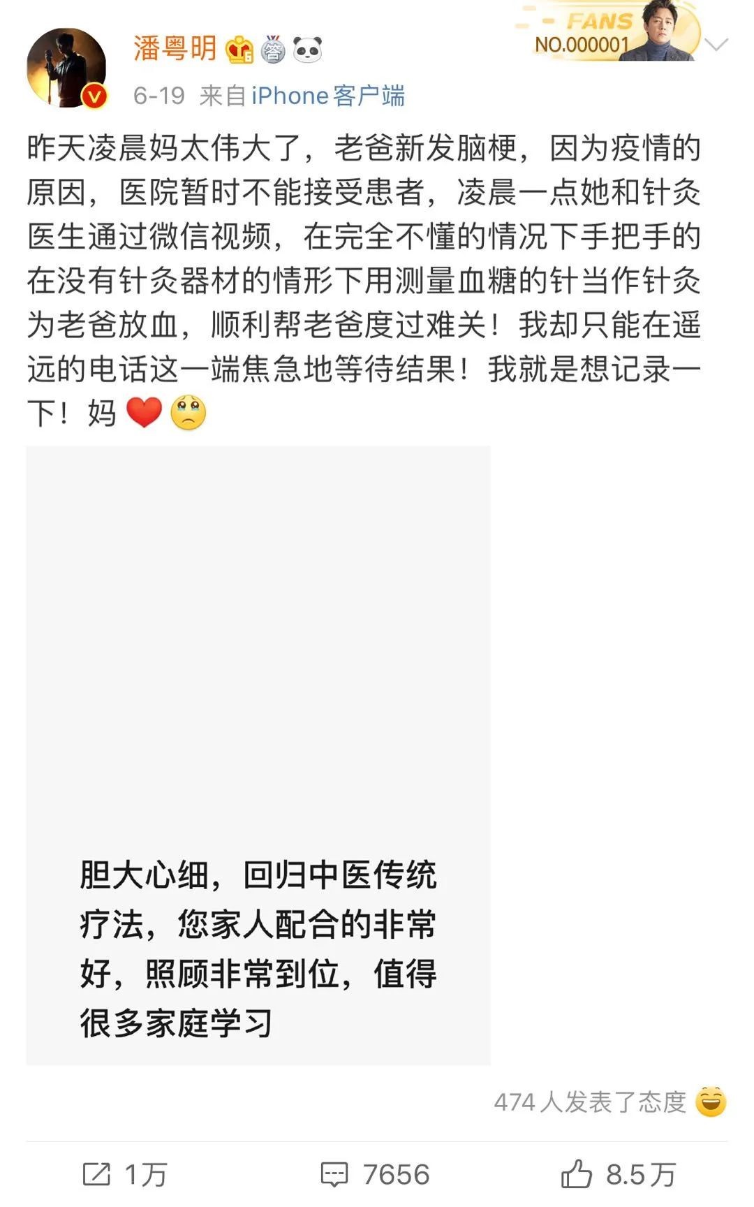 19日,潘粤明发布微博称,18日凌晨父亲新发脑梗,因为疫情的原因,医院暂时不能接受患者,后来妈妈通过与针灸医生视频,在完全不懂的情况下帮父亲渡过难关。