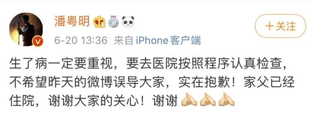 6月20日,就父亲自行在家治疗的争议,潘粤明再次发文称“生了病一定要重视,要去医院按照程序认真检查,不希望昨天的微博误导大家,实在抱歉!”