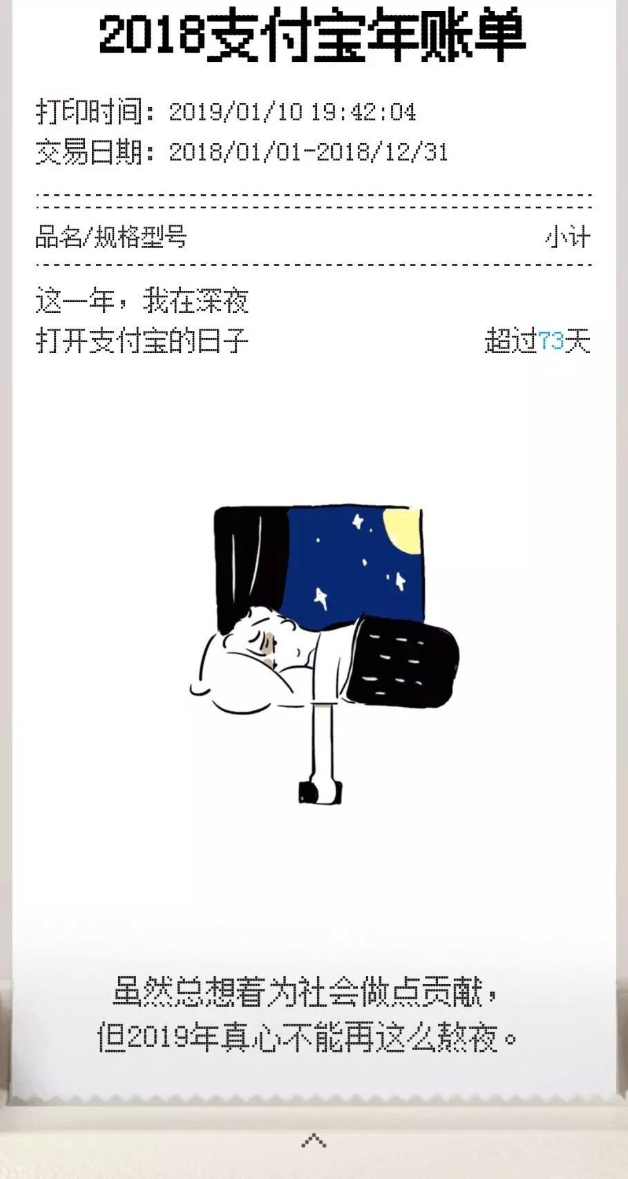 账单统计了你去年在深夜打卡支付宝的天数、全年消费总额、消费金额最高的项目和月份等。