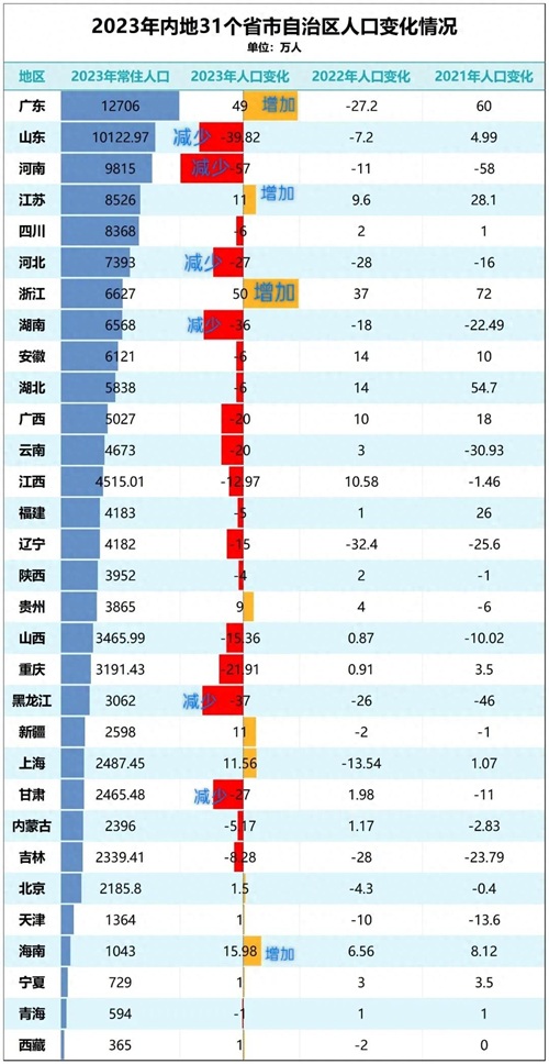 2023年内地31个省市自治区常住人口发布:连续3年河南和东三省降