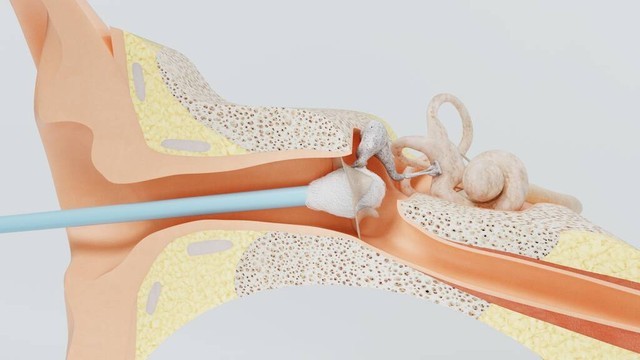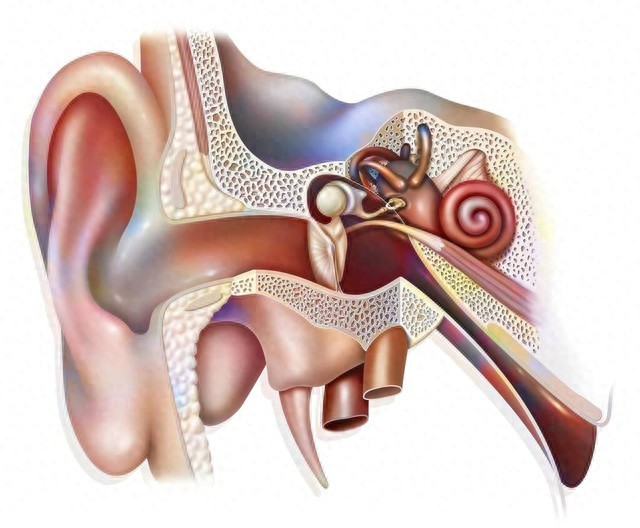 中耳是位于鼓膜后面的一个空腔,它是通过三块小骨头——听骨(包括锤骨、砧骨和镫骨)与外耳相连。这三个小骨头通过振动的方式将外耳输入的声音转化为机械能,然后传输到内耳。此外,中耳还具备调节气压的功能,通过耳咽管与咽部相连,使中耳与外界的气压保持平衡。