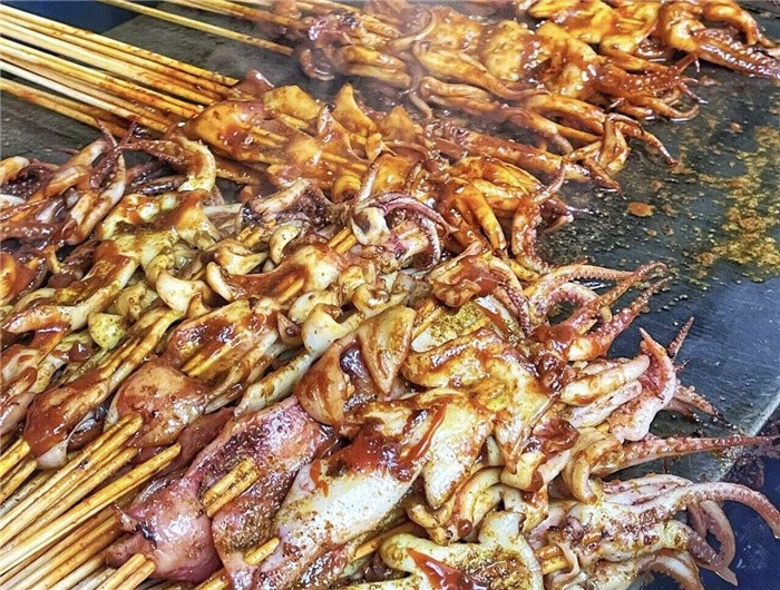 用竹签穿好的鱿鱼放在在滚烫的铁板上来回烤制,完了后再刷上辣椒酱等配料,吃起来脆嫩爽口,很是过瘾,让人回味无穷。