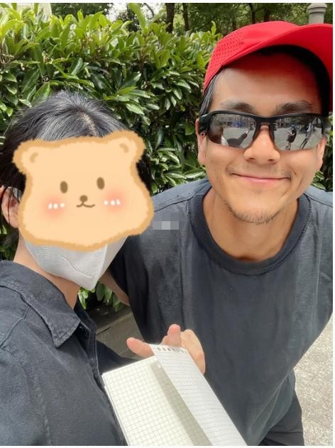 来合影中,彭于晏穿着运动T恤,颜色有些发白,戴着一顶红色的帽子和黑色的墨镜。头发不知道是不是因为光线的原因,两鬓显得有些花白,胡子也没有刮干净,但和女粉丝的合影还是非常的开心,微笑十分灿烂。