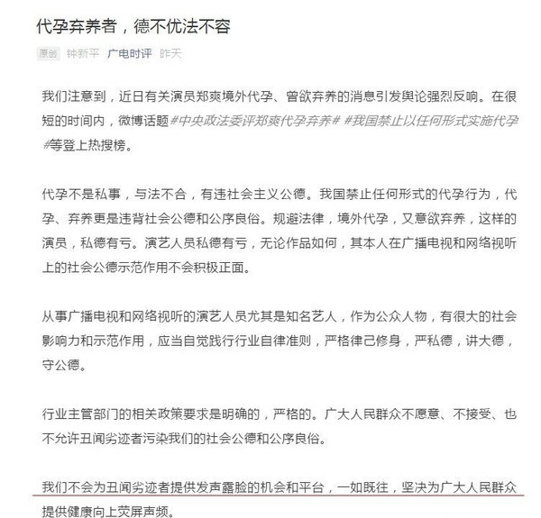 虽然舆论沸沸扬扬,但郑爽在前天的回应中对代孕和弃养绝口不提。而这一行为更是引起了众多网友的愤怒。在接连受到官媒谴责、广告商取消合作、华鼎奖取消荣誉称号下,广电时评也在平台上刊发,称不会给郑爽发声露脸的机会!这也意味着,郑爽真是被封杀了!