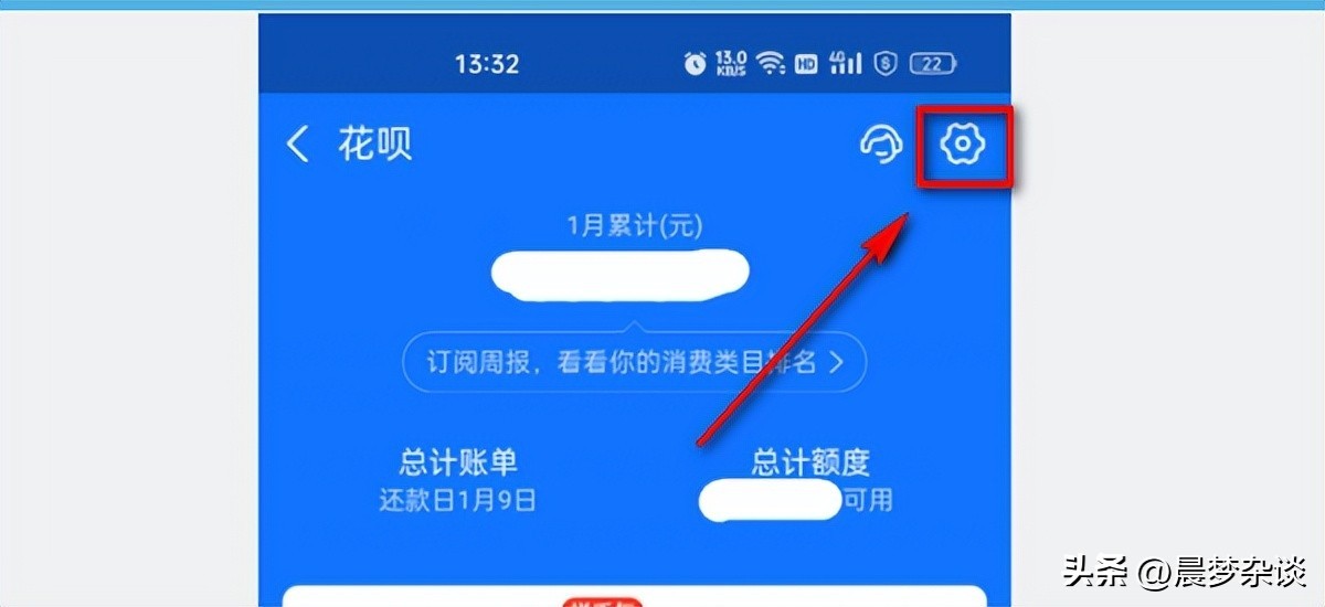 步骤三:在花呗主界面中,点击其右上角的“齿轮”按钮,进入设置页面;