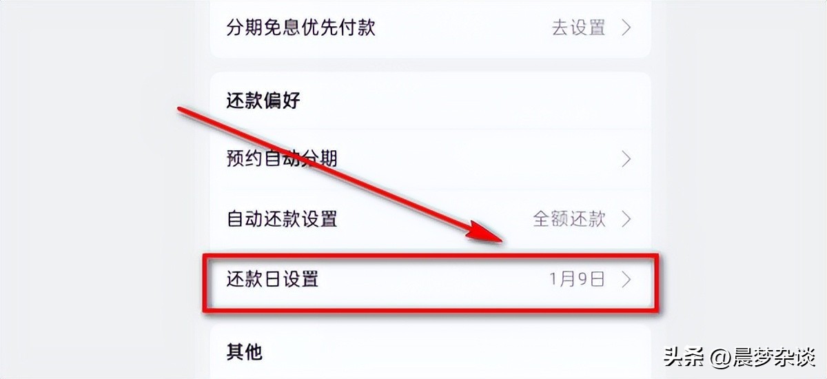 步骤四:在设置界面中有很多选项,我们将手机页面往下拉,直到找到“还款日设置”选项,点击进入;