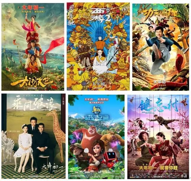 六部大片“逐鹿”春节档:《大闹天竺》、《西游伏妖篇》、《功夫瑜伽》、《乘风破浪》、《熊出没·奇幻空间》、《健忘村》。