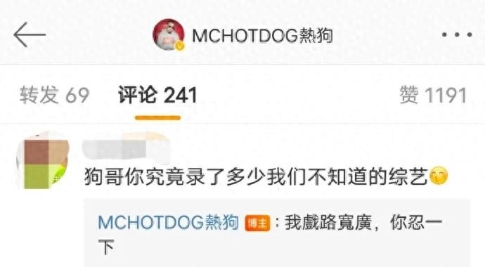 8月7日,OG说唱歌手MChotdog热狗,在社交平台发布自己新参与的综艺,#披荆斩棘的哥哥#,并且在评论区与网友互动,玩梗回复到:“我戏路很宽广,你忍一下”。