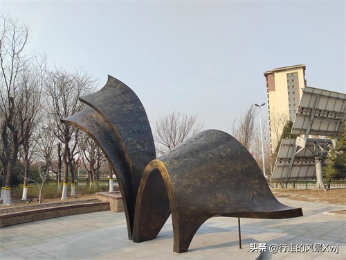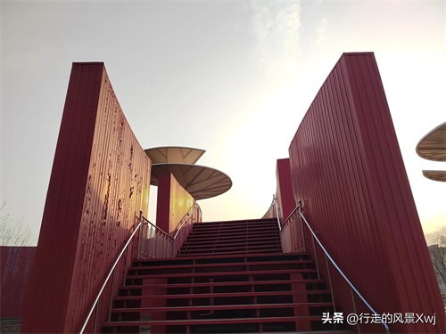 从东门进入园博园,首先看到的是主入口广场。广场地面铺装镶嵌有铁轨,寓意着石家庄是火车拉来的城市,展示了城市的发展历史。