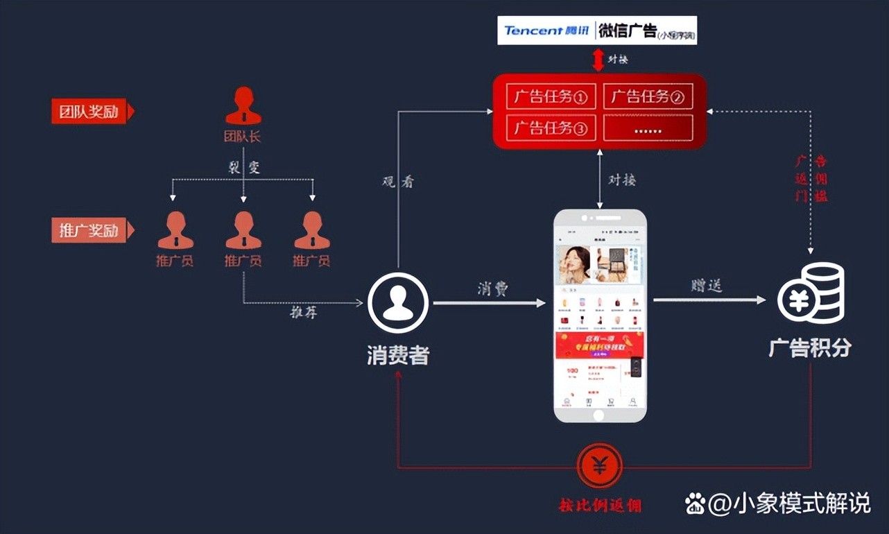 消费者在平台任意消费即可获得积分,通过观看广告任务,平台根据消费者剩余积分按比例返佣为零钱,零钱可提现、可消费。