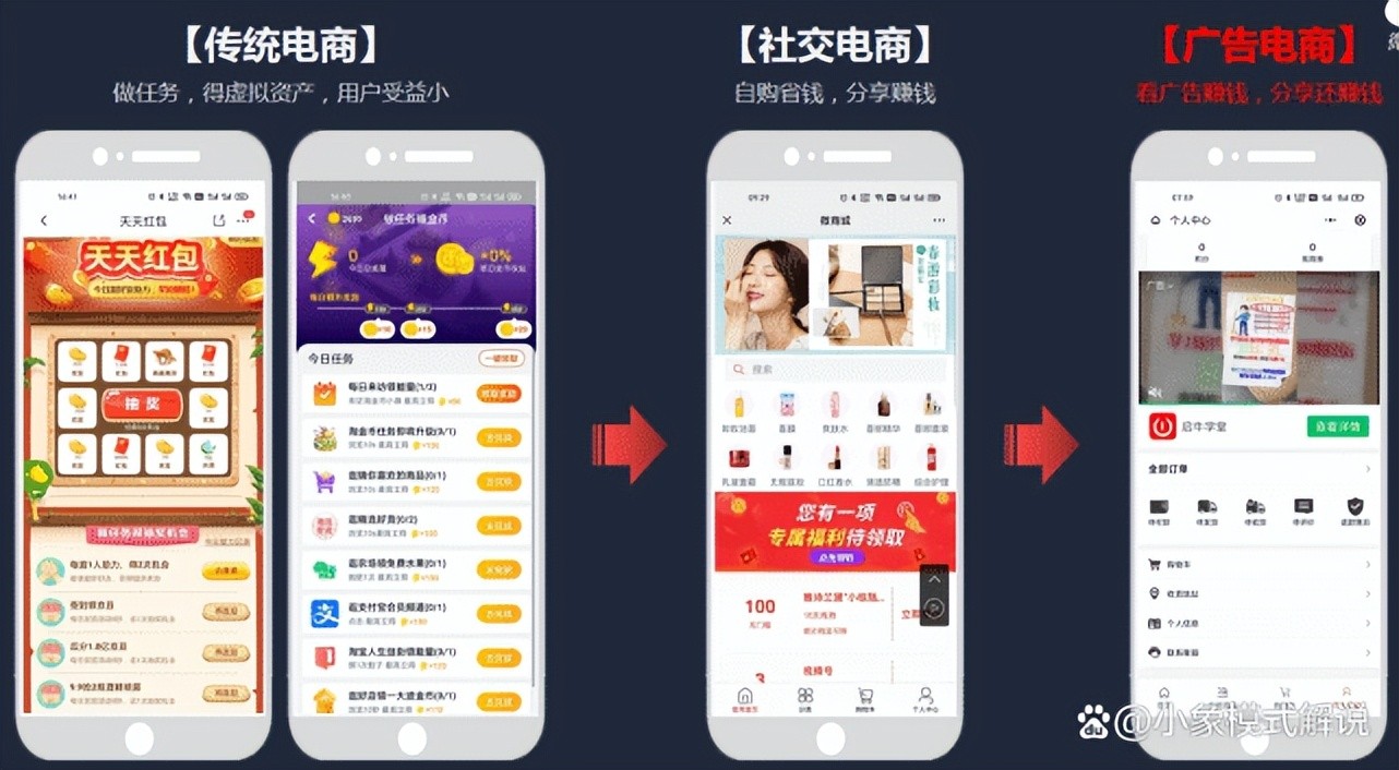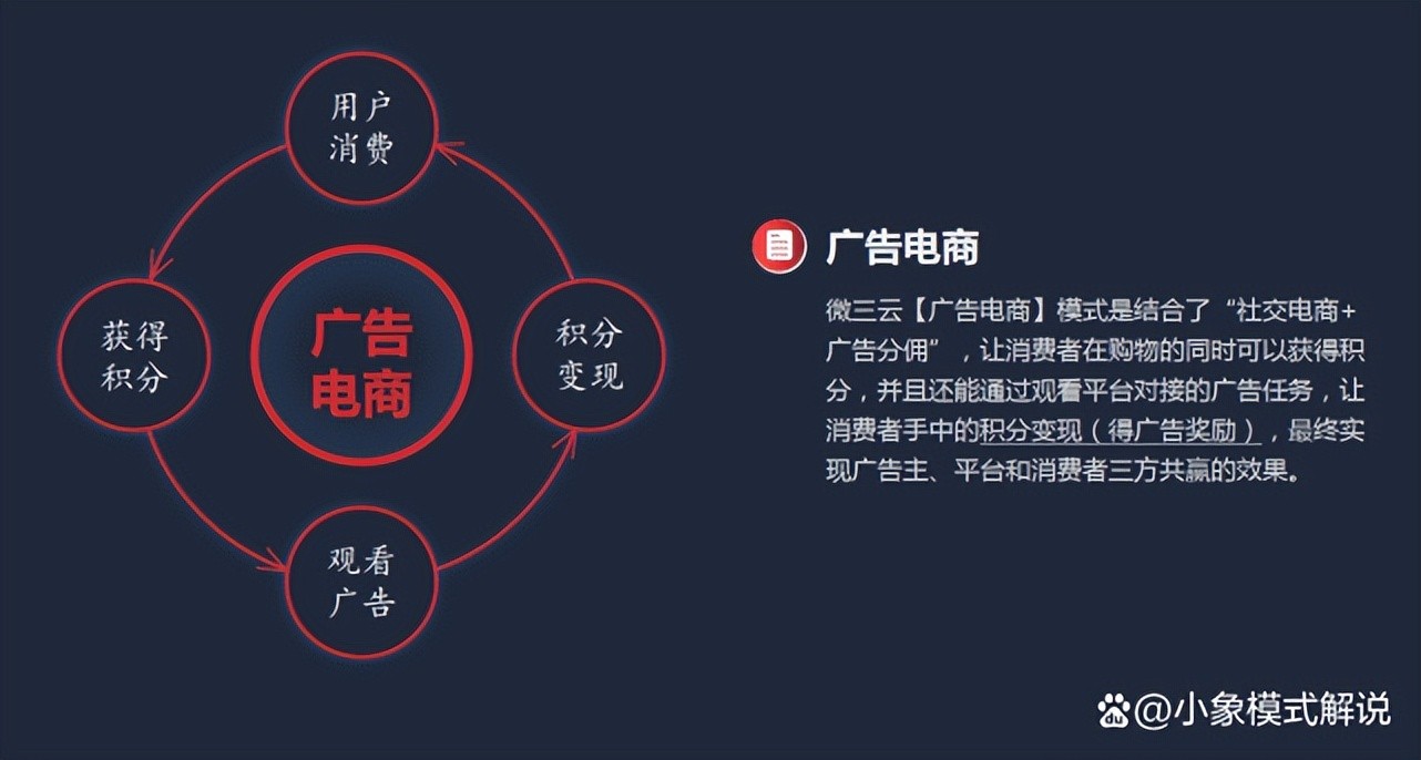 广告电商,又或是指的是和第三方合作,同时平台为了奖励用户,可以设定一些广告任务,当用户完成任务,平台可按一定的规则与用户分钱,达到平台、用户、商家之间相互推广的作用,这就是我们所说的广告电商。