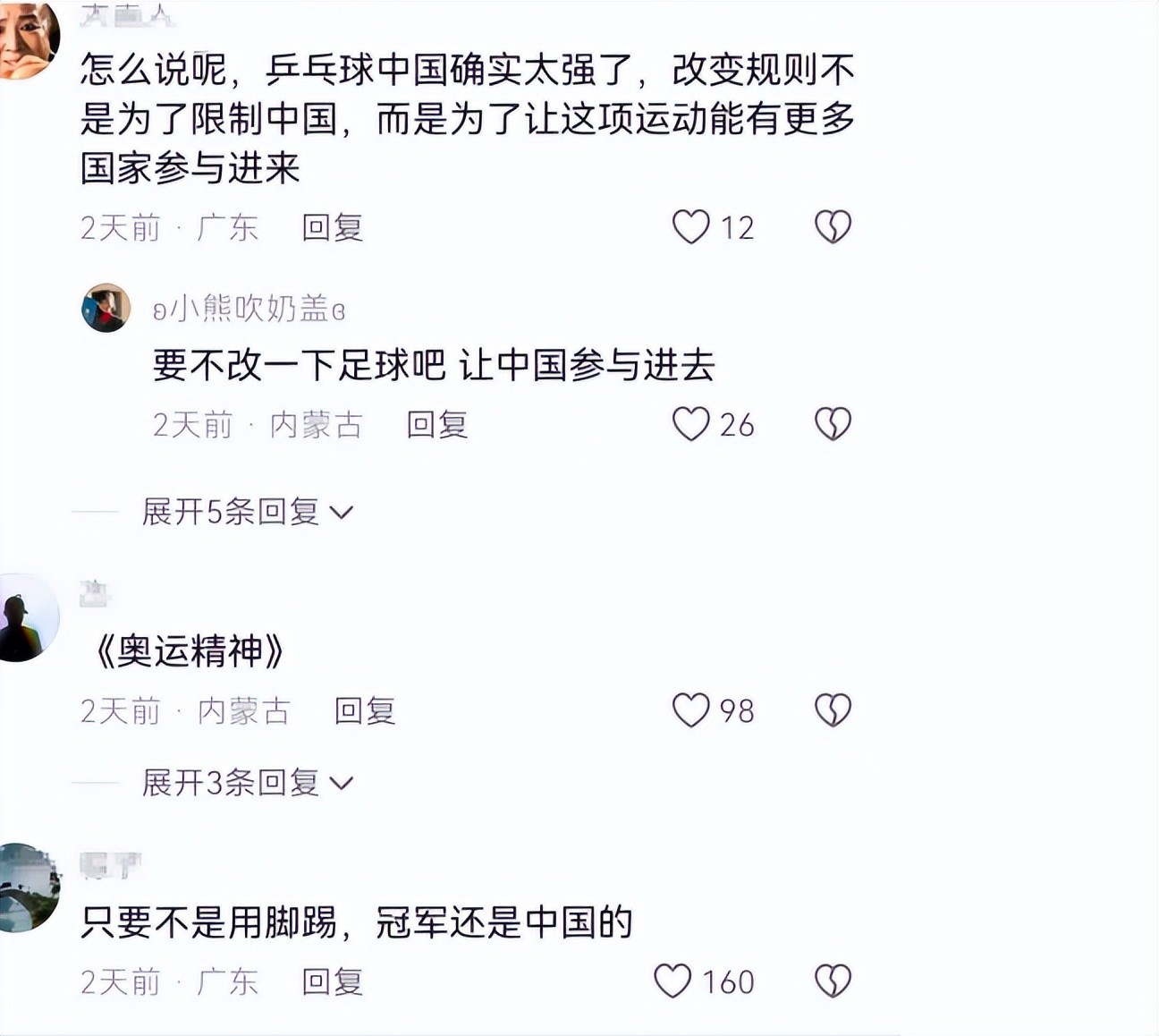 还有网友提议:说比赛期间禁止中途出去换球衣,难道就被马龙和樊振东换球衣给打怕了吗?乒乓球的规则变来变去我们也能接受,但是不换球衣就是身上难受啊。还有网友说2025年禁止中国队参赛,这个规则估计通过不了,不好改啊!