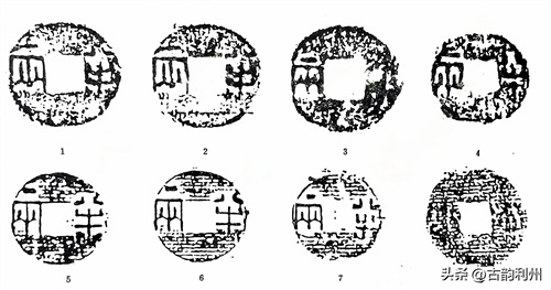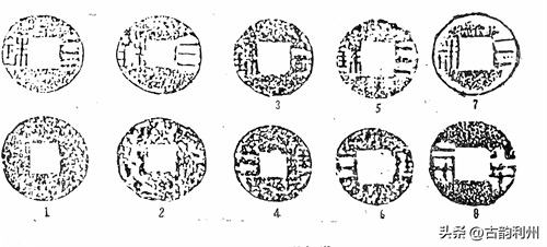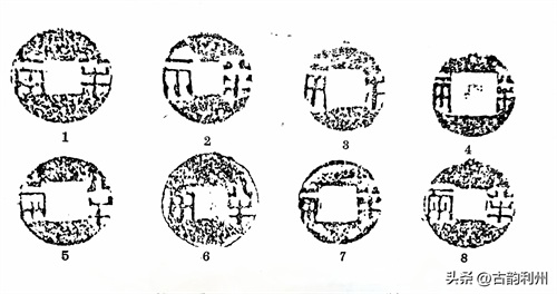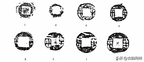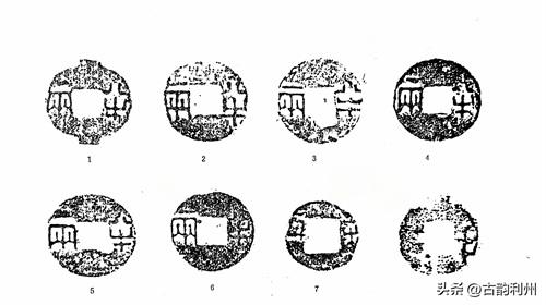 《汉书·高后纪》:二年秋七月,“行八铢钱”。应劭曰:“本秦钱,质如周钱,文曰‘半两’,重如其文,即八铢也,汉以其太重更铸荚钱,今民同名榆荚钱是也。民患其太轻,至此复行八铢钱”。此即钱学界所说的“汉八铢”。这次“复行八铢钱”是沿用秦钱还是另有新铸?向来为钱学研究之谜。盖半两十二铢者,本为秦钱之法定比值,不必尽如其称量标准。即就战国秦钱而论,足十二铢者也是少数。何况“随时而轻重无常”,很难以铢重划出标准。应《注》所言“本秦钱,文曰‘半两’,重如其文,即八铢也”。语意含糊,既云“文曰半两,重如其文”,又云“即八铢也”。即以大小而论,秦初铸钱与晚期铸钱即有大小二型(见上),若以“重如其文”而言,所言似指大钱,若以晚期秦半两而论(所谓“即八铢也”),则复行八铢者应指小型半两钱。今汉初通行半两品类颇多,1977年安徽阜阳妆阴侯灶夫妇墓出土之西汉半两钱,钱径多近3厘米。应属秦之大钱型。夏侯灶死于文帝十五年(前165年),上距秦亡(前207年)已四十二年,三十三枚半两钱。其中大 型者1枚,中型者12枚,小型者20枚,中型者直径约3厘米,小型者约2.7厘米,个别约2.2厘米,其文字略同于秦钱,但大多“半”字二横划等长,有的半字下横如同上横两端上翘,不类秦钱写法(图六:1~4)。1986年徐州北洞山文景时期楚王陵出土半两钱七万余枚,其中除少数可确知为秦钱外,多数为四铢半两型。但有的则与秦之小型半两相似(图六:5~7)。钱径2.7、穿宽0.9厘米,“半”字上下二横近乎等齐。周边多有隐廓,亦似属汉制。然应《注》既未指明为何种钱型,故无从确知何者为“汉八铢”矣。然秦半两大小二型,今既云“复行八铢”,则所指应为秦代晚期之小型半两而言。今者往往以秦之小型半两钱为“汉八铢”,宜其判定年代多误也。因举上述所出二种半两钱为例六(图六)。