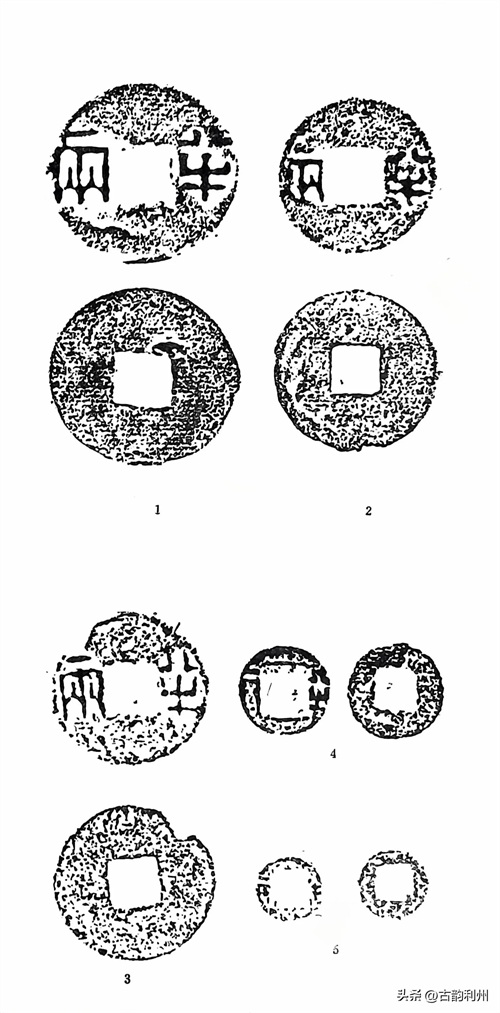汉兴,承秦制,仍用半两钱,经过五年的楚汉战争,民生凋敝,财政匮乏,但在社会经济亟待恢复的同时,商业经济又在迅速发展,急需货币流通。以少而重之秦钱来满足当时的经济需要,显然是不可能的。故谓“秦钱重难用,更令民铸荚钱”。如淳注:“如榆英也”。因荚钱极言其小,故后世多以不盈指的小钱为荚钱,其实这种小钱,在汉初出土者种类甚多,大小亦甚悬殊。如山东章丘出土的荚钱石范,钱径仅为0.6厘米,一范上刻钱模多达三百二十四枚,莒县博物馆藏博兴出土荚钱石范、博兴文管所藏辛张出土石范,钱径1.2厘米,一次可铸钱八十四枚。也有直径可大至2.0厘米以上者,盖荚钱既属放铸,豪强减铜牟利,钱益多而轻,而“不轨逐利之民蓄积余盈,以稽市场,痛腾跃,米至石万钱,马至匹百金”。形成汉初钱币的恶性贬值。事实上,这些都是经过大量减重后的荚钱。汉初规定的荚钱并非如此。《史记·平准书》《集解》引《古今注》云: “榆荚钱重三铢”,可见荚钱也是有法定重量的。1982年四川涪陵西汉土坑一号墓出土之汉初半两钱,多数应为汉初行使之正规荚钱四,钱径最大者2.36、穿0.97厘米,重1.9克,最小者1.56、穿径0.75厘米、重0.7克,最轻者仅为0.3克,大者1.8克左右,约合汉制三铢(图五)。