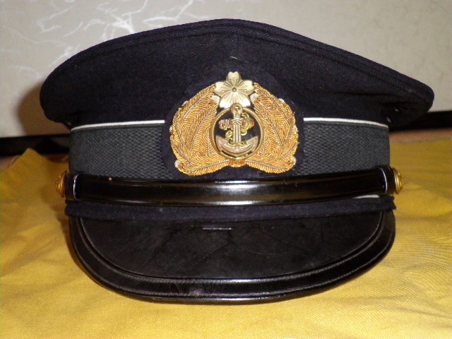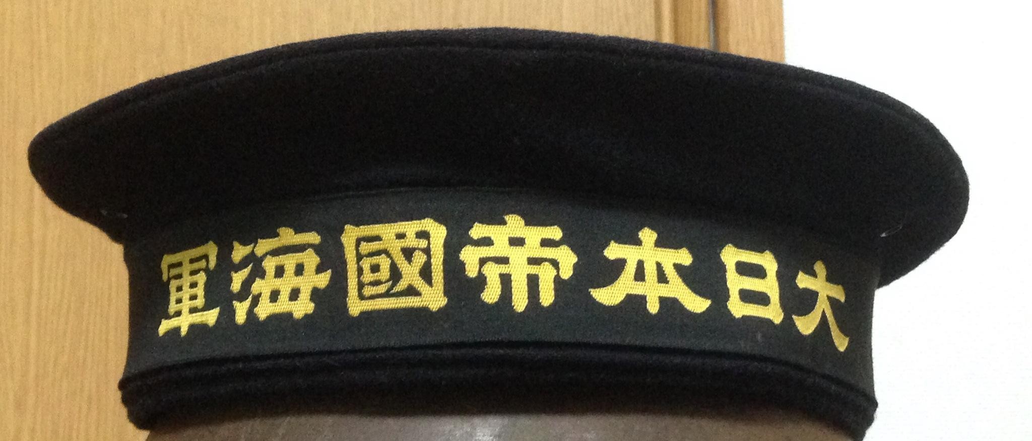 军帽是大檐帽样式,材质为绀罗纱(藏青色厚羊毛织物),正面是帽章,黑色漆皮帽檐,黑色漆皮下巴带用两个金色纽扣固定在左右两侧。帽墙材质为市松织黒毛线(方格棋盘纹理)。