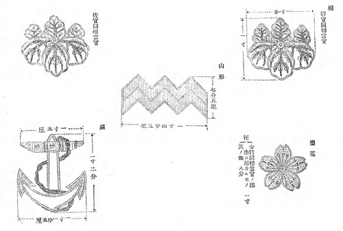 飘带上用金线刺绣的军舰和单位名称,飘到两端是金色船锚。礼装上的飘带还带有金线装饰刺绣。大正4年(1915年)11月5日取消了礼装飘带。