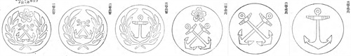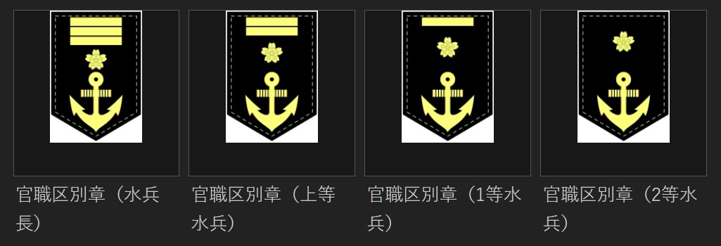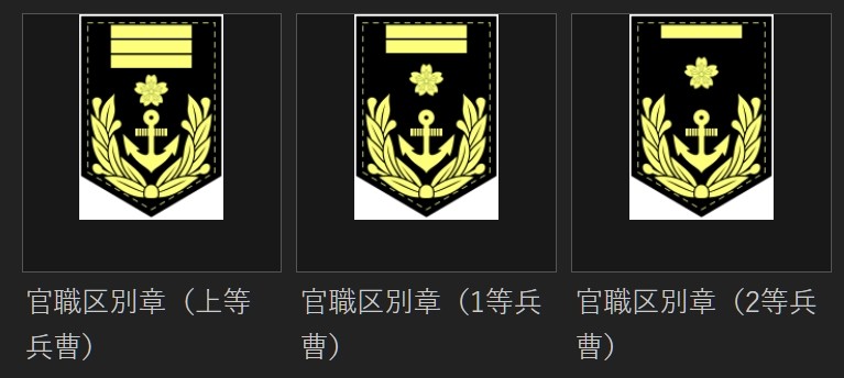 水兵的阶级章样式类似于军士,最上面是0到3条黄条代表军衔高低,樱花和船锚。