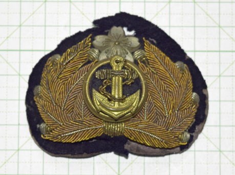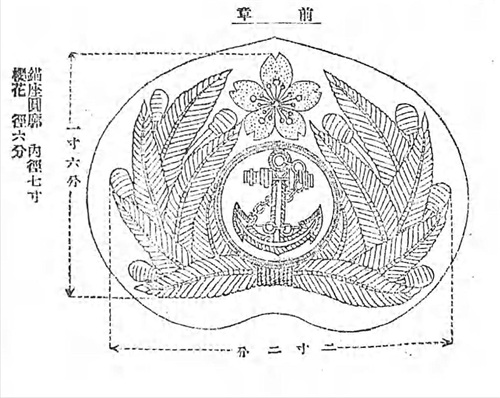 军帽上的帽章长1寸6分(约4.848厘米),宽2寸2分(约6.666厘米)。帽章的底布和军帽颜色一样,中间的救生圈和船锚由金色金属制成,上面的樱花由银色金属制成,四周的樱叶是金线刺绣,叶子上果实是银线刺绣。