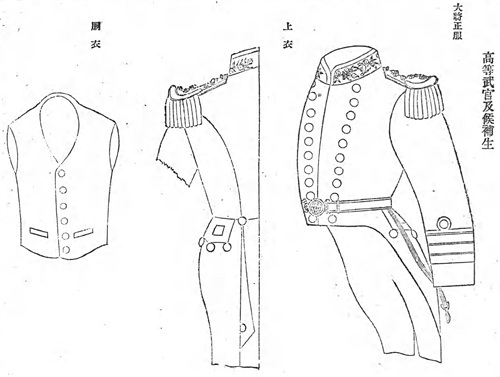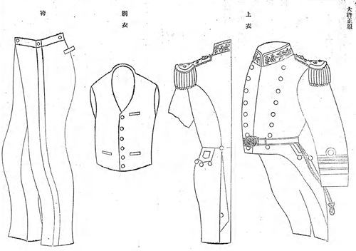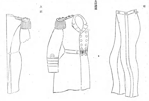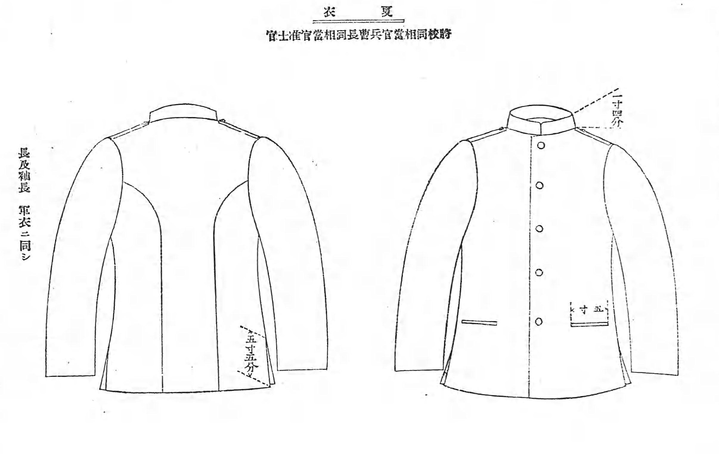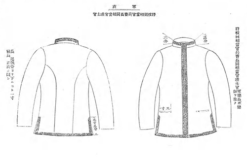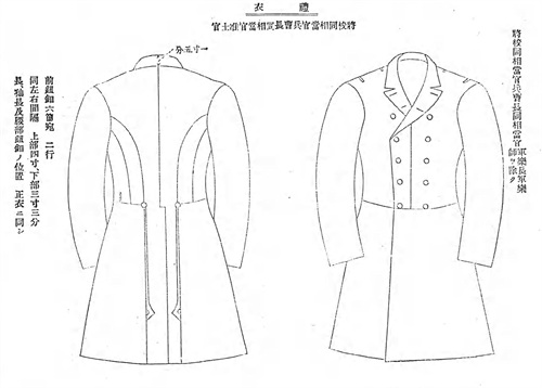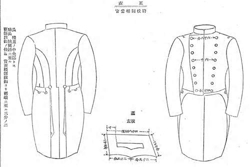 明治16年(1883年)将翻领燕尾服定为礼服,但在明治20年(1887年)取消了该规定,以佩戴正肩章的大衣代替,被称为“礼服上衣”。明治26年(1893年)12月27日正式规定礼服上衣为双排扣大衣。