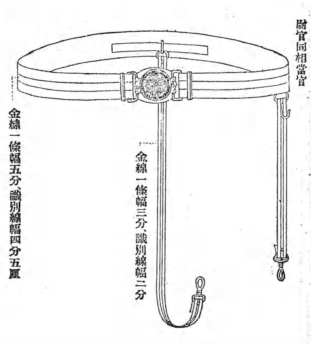 正剑带由皮革制成,左侧有两条悬挂配件的带子。将官的正剑带表面有一条1寸(约3.03厘米)宽的金线,佐官为两条5分(约1.515厘米)宽的金线,尉官为1条5分(约1.515厘米)宽的金线。