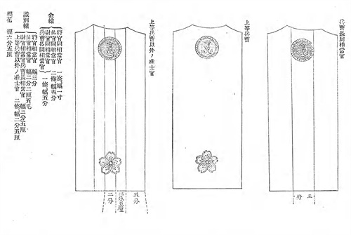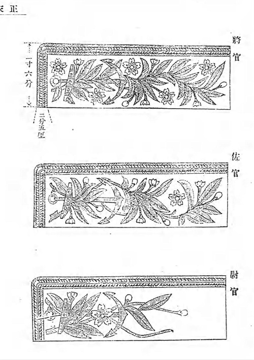 正服袖口的袖章使用金色,用条纹代表军衔。共有三种粗细尺寸的条纹:细线2分5厘(约0.575厘米),中线5分(约1.515厘米)和粗线1寸(约3.03厘米)。