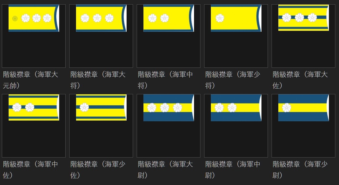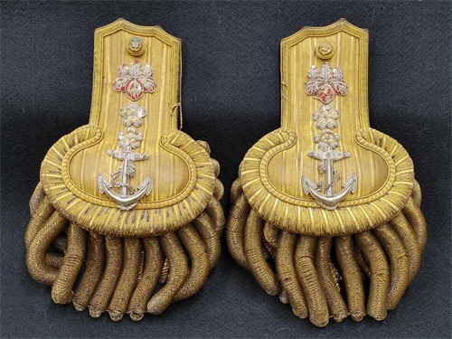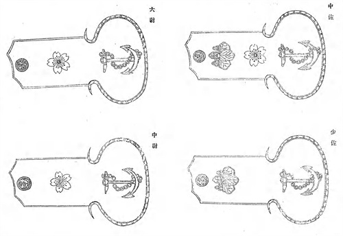 将官正肩章从纽扣处开始为五七桐,两个山形线和樱花(在椭圆形盘),其中三个樱花呈三角排列为大将,两个樱花竖直排列为中将,一个樱花为少将。佐官正肩章从纽扣处开始为五三桐,樱花和船锚(在椭圆形盘),其中大佐为两个樱花竖直排列,中佐为一个樱花,少佐无樱花。尉官正肩章从纽扣处开始为樱花和船锚(在椭圆形盘),其中大尉为一个樱花加穗带,中尉为一个樱花无穗带,少尉为无樱花无穗带。