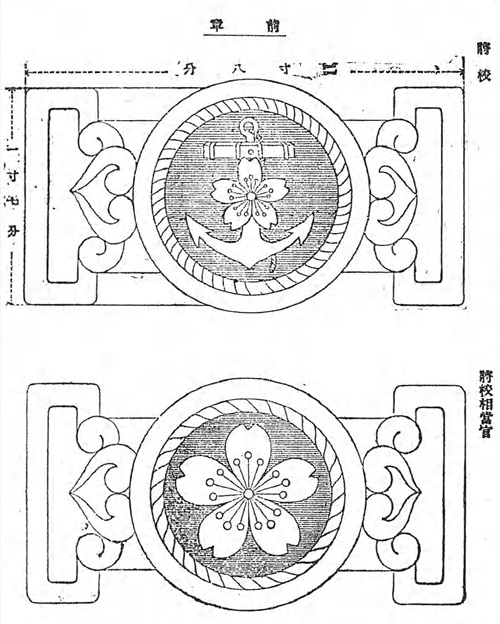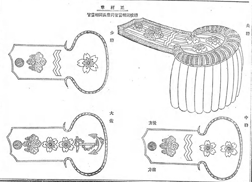 正肩章由长方形肩章和椭圆形盘组成。正肩章上用桐叶(将官为五七桐,佐官为五三桐),樱花,山形线和船锚徽章来表示军衔高低。大尉及以上军衔的椭圆形盘上有外内穗带。将官和佐官外穗带17条,长度2寸8分(约8.484厘米),直径4分4厘(约1.333厘米);将官和佐官的内穗带16条,长度2寸7分(约8.181厘米),直径2分2厘(约0.666厘米);大尉外穗带22条,长度2寸3分(约6.969厘米),直径3分3厘(约0.999厘米);大尉外穗带21条,长度2寸2分(约6.666厘米),直径2分2厘(约0.666厘米)。