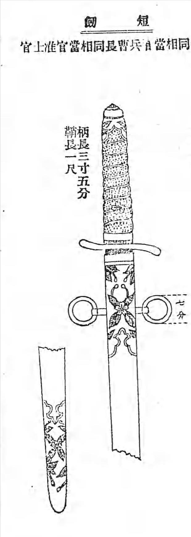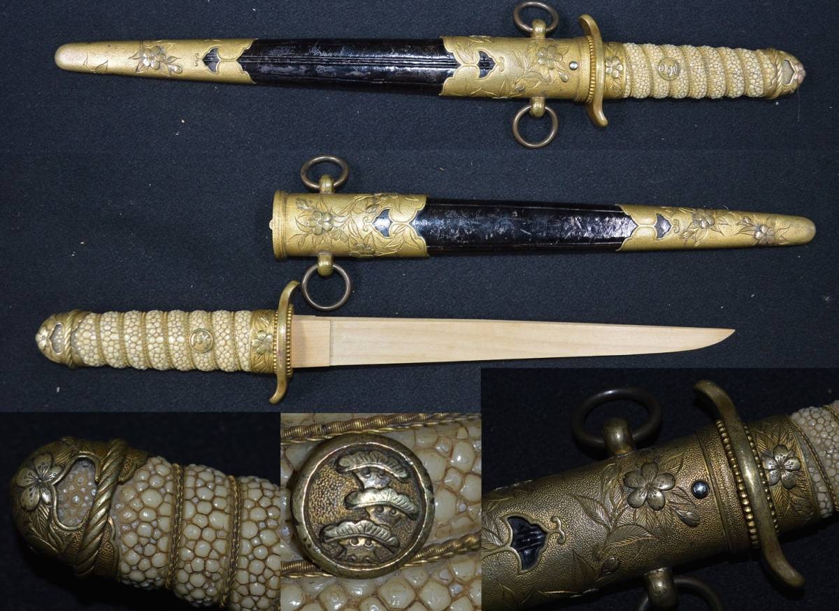 短剑剑柄长3寸5分(约10.606厘米),剑鞘长1尺(约30.3厘米)。剑柄表面覆盖白鲛皮(白色鲨鱼皮)并缠绕金线。剑鞘为木制包裹黑色或棕色皮革,前后带有金色金属配件,上面有樱花叶图案,后配件带有两个金属吊环用于悬挂短剑。