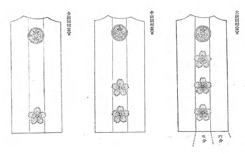 正衣的立领金线刺绣图案可以用来辨别军衔,从上到下分别是将官,佐官和尉官