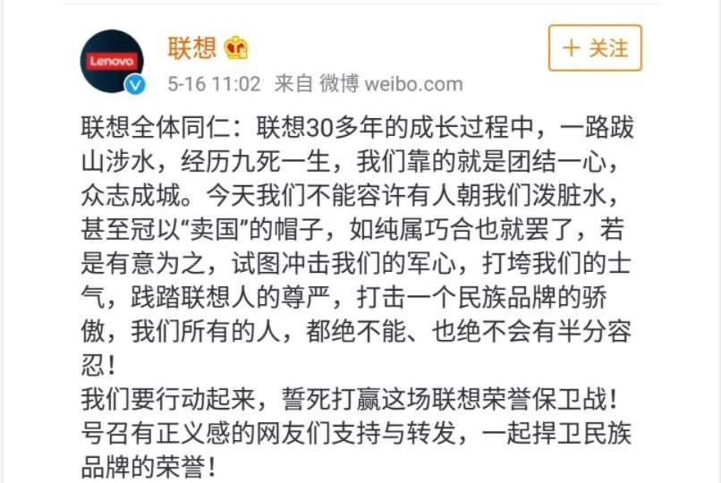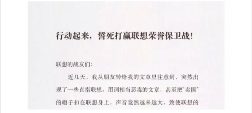 联想集团的全体同仁,今天的我们,正面临着严峻的挑战。我们有失误,就要以非常谦虚、开放的态度,面对现实、寻找解决问题的方法。联想30多年的成长过程中,一路跋山涉水,经历九死一生,我们靠的就是团结一心,众志成城。今天我们不能容许有人朝我们泼脏水,甚至冠以“卖国”的帽子,如纯属巧合也就罢了,若是有意为之,试图冲击我们的军心,打垮我们的士气,践踏联想人的尊严,打击一个民族品牌的骄傲,我们所有的人,都绝不能、也绝不会有半分容忍!