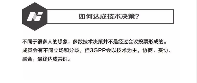 一名业内人士形容,3GPP就像通信行业的“联合国”,要在立场和出发点不同的成员中间达成一致,这是一个不断博弈、妥协求同存异的过程。任何一家成员公司反对某个具体提案,都需要3GPP组织者做很多协调工作,直至达成共识,过程相当繁琐。但这也维护和保证了全球互通的无线通信技术。