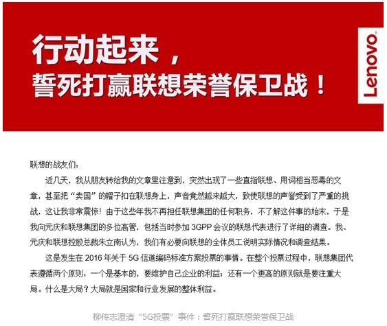 2018年5月16日,针对联想“5G投票”事件引发的舆论风波,联想控股董事长、联想集团创始人柳传志及联想集团董事长兼CEO杨元庆、联想控股总裁朱立南面向全体联想人,发出一封主题为《行动起来,誓死打赢联想荣誉保卫战》的内部信,说明“5G投票”实际情况和调查结果。