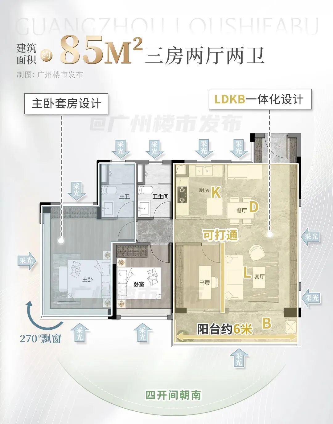 南向四开间、超120%的得房率、LDKB一体化设计、四开间南向、主卧270°飘窗…这些都是标配。