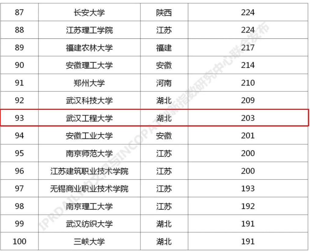 2021年6月,知识产权产业媒体IPRdaily与incoPat创新指数研究中心联合发布“中国高校专利转让排行榜(TOP100)”,前100名中国高校主要分布在江苏、北京、浙江、陕西、湖北、上海、广东等24个省市,国内专利转让数量均在191件及以上。其中,武汉工程大学以203件专利跻身前100,位列全国第93位、在汉高校第4位、省属高校第2位。