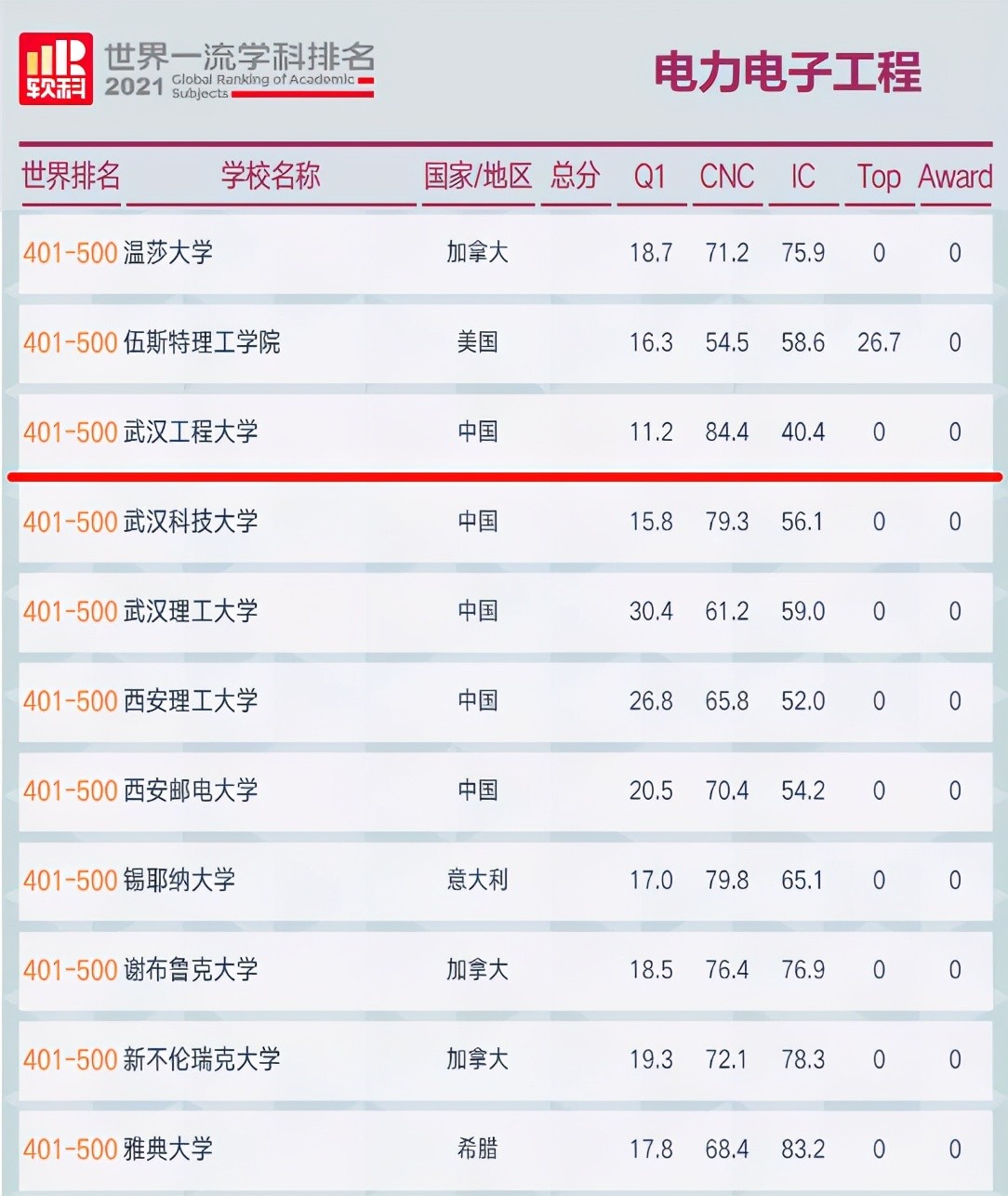 其中,武汉工程大学电力电子工程首次进入世界一流学科排名,位居第401-500位。