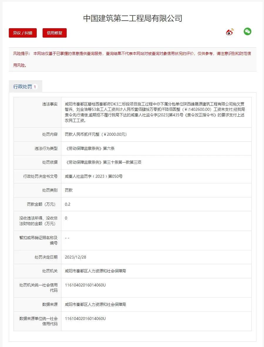 近日,信用中国(陕西)网站发布一条双公示信息:中国建筑第二工程局有限公司因下属分包单位拖欠53名农民工工资共计1402600元未支付,被罚2000元。