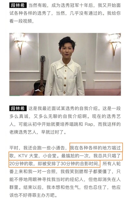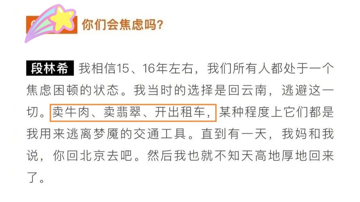 6月13日,2011年快女冠军段林希近日接受采访的内容被发布在网络上,在访谈中段林希自曝曾选择卖牛肉、买翡翠、开出租车,开新社交号做微商作为谋生职业。