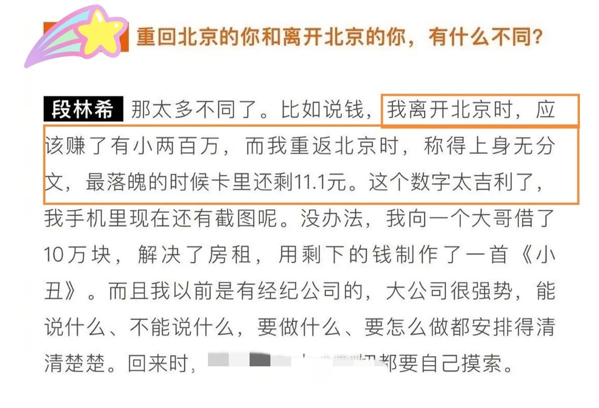 当记者提问重回北京和当初离开北京有什么不同时,段林希表示离京时自己赚了大概200万,而返京时她的经济状况并不好,最低谷时身上只有11.1元。如今几年过去她的情况也好转很多,收入好的时候可以月入8万,除去团队费用和房租大概剩1万可自由支配。