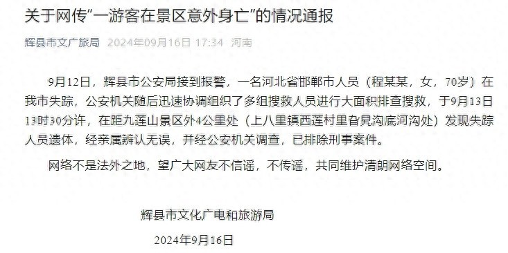 9月12日,辉县市公安局接到报警,一名河北省邯郸市人员(程某某,女,70岁)在我市失踪,公安机关随后迅速协调组织了多组搜救人员进行大面积排查搜救,于9月13日13时30分许,在距九莲山景区外4公里处(上八里镇西莲村里旮旯沟底河沟处)发现失踪人员遗体,经亲属辨认无误,并经公安机关调查,已排除刑事案件。