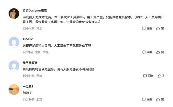该帖发布后迅速引发热议,评论区有网友表示:“海底捞最核心的就是服务,这无异于自断根基。”还有网友认为,海底捞这一做法,节省人力开支挺明显的。但服务质量一降,老顾客会觉得不值,毕竟服务是他们核心卖点。也有网友分享自己近期的就餐体验,称自己为了海底捞美甲服务去就餐,明显感觉服务细致度较以往有所下降。