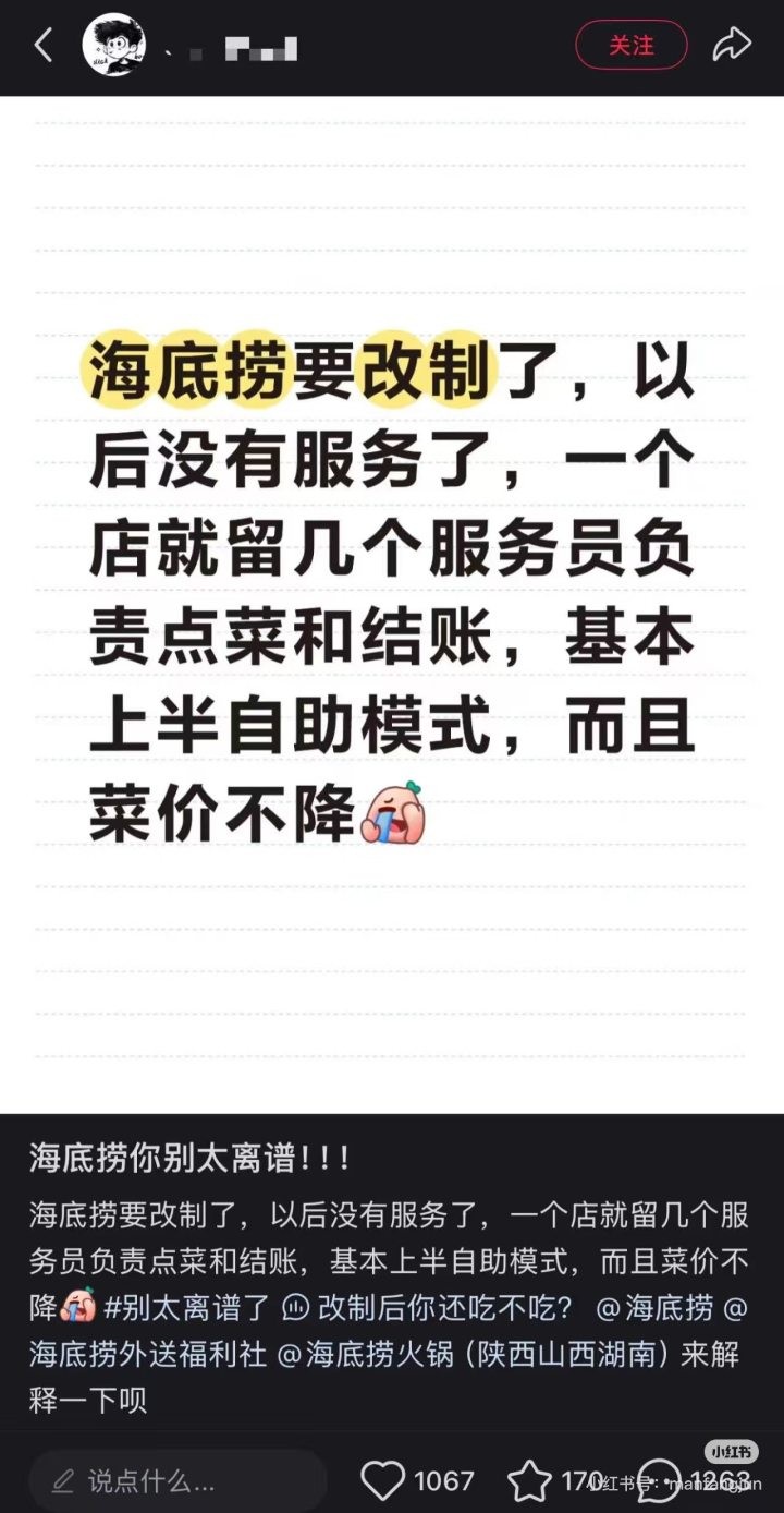 8月5日,有网友在小红书上发帖称:海底捞要改制了,以后没有服务了,一个店就留几个服务员负责点菜和结账,基本上半自助模式,而且菜价不降。”