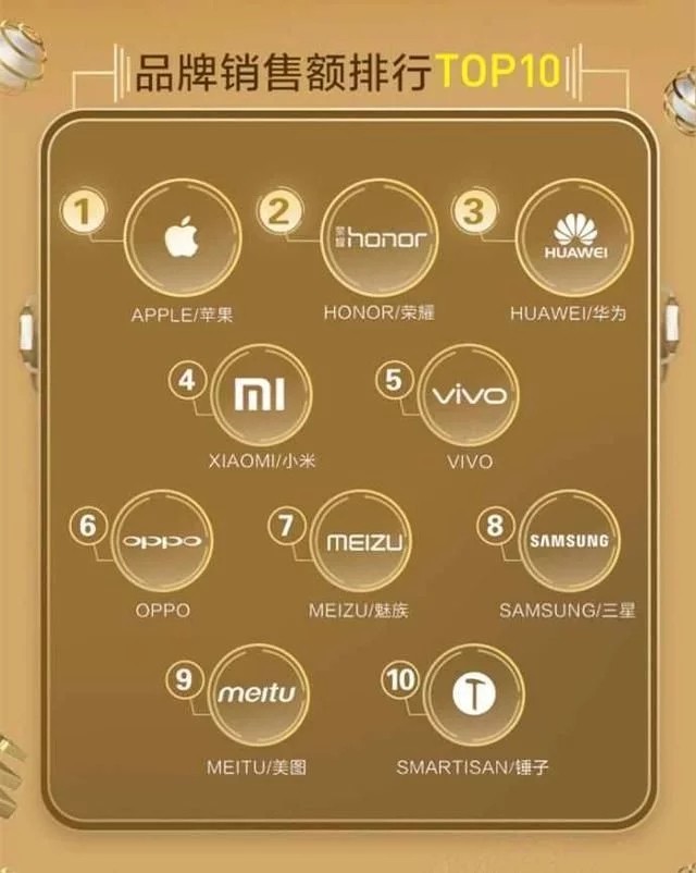 苹果、荣耀、华为、小米、vivo、OPPO、魅族、三星、美图、锤子