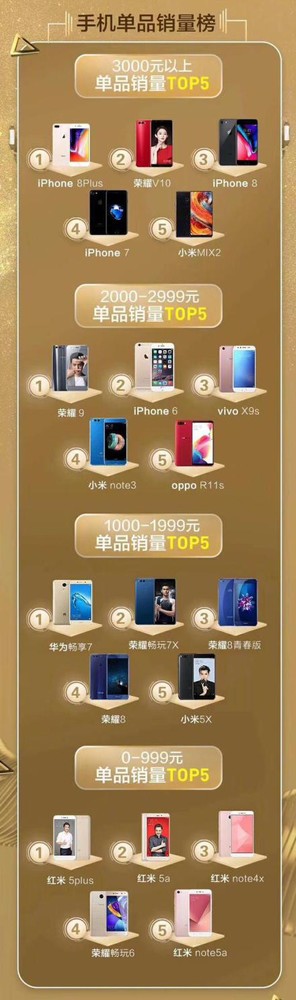 千元以下单品销量Top5以红米手机居多,分别为红米5Plus、红米5A、红米Note4X、荣耀畅玩6、红米Note5A。