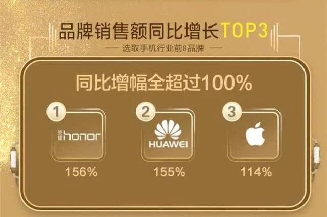 荣耀同比增长156%,华为同比增长155%,苹果同比增长114%